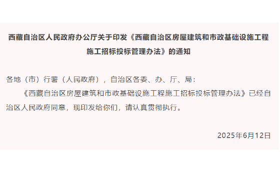 近日,西藏自治区人民政府办公厅发布关于印发《西藏自治区房屋建筑和市政基础设施工程施工招标投标管理办法》的通知。